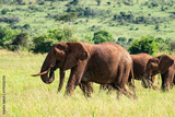 An African elephant wanders alone among tall, dry grasses, with lush, green trees in the background, under the bright skies of Kenya, Africa.