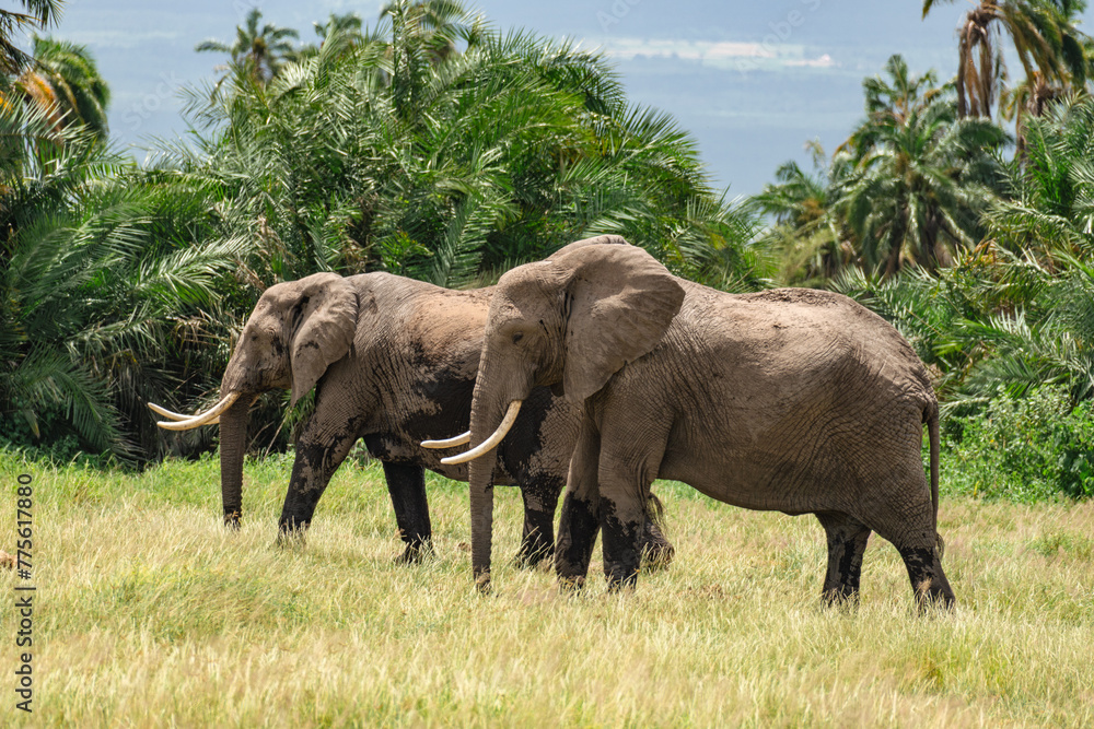 Young African Bush Elephants standing close together, amongst lush green grasses. They have been rolling in the red mud. Lake Amboseli, Kenya