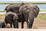 group of elephant families go to the water's edge for a drink - African elephants standing near lake in Etosha National Park, Namibia