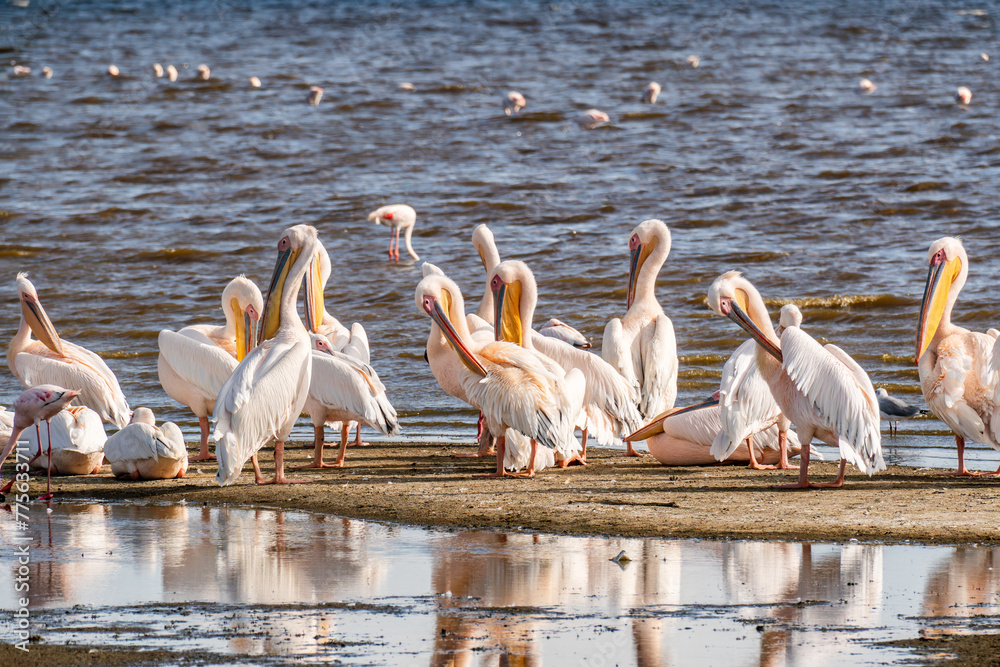 A scoop of pelicans on coast of Lake Nakuru, Kenya