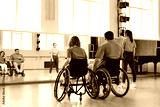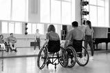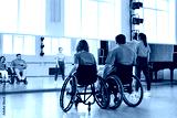 Rear view diverse people practicing dance with wheelchairs in front of mirror in studio, long shot