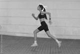 Young woman in sportswear is running on modern buildings background. Active lifestyle concept