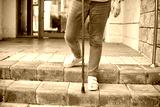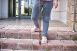 Senior woman on a rehabilitation after surgery with walking cane outdoors.