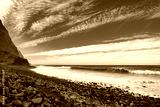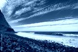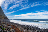 The rocky coast of Madeira, as seen from the Achadas da Cruz viewpoint. Green slopes, a white beach, and blue sea are visible under a partly cloudy sky. The overall mood of the picture is calm and