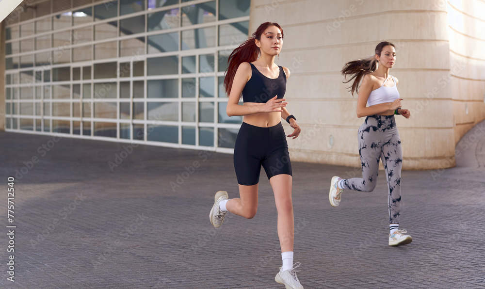 Two young women in sportswear are running on modern building background. Active lifestyle concept