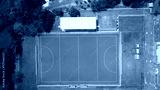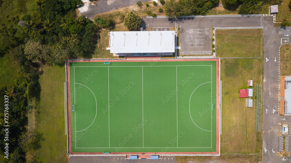 Aerial view of an artificial grass field hockey pitch. The sports center is empty and there is no one there.