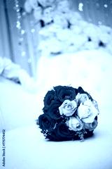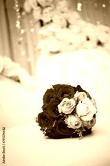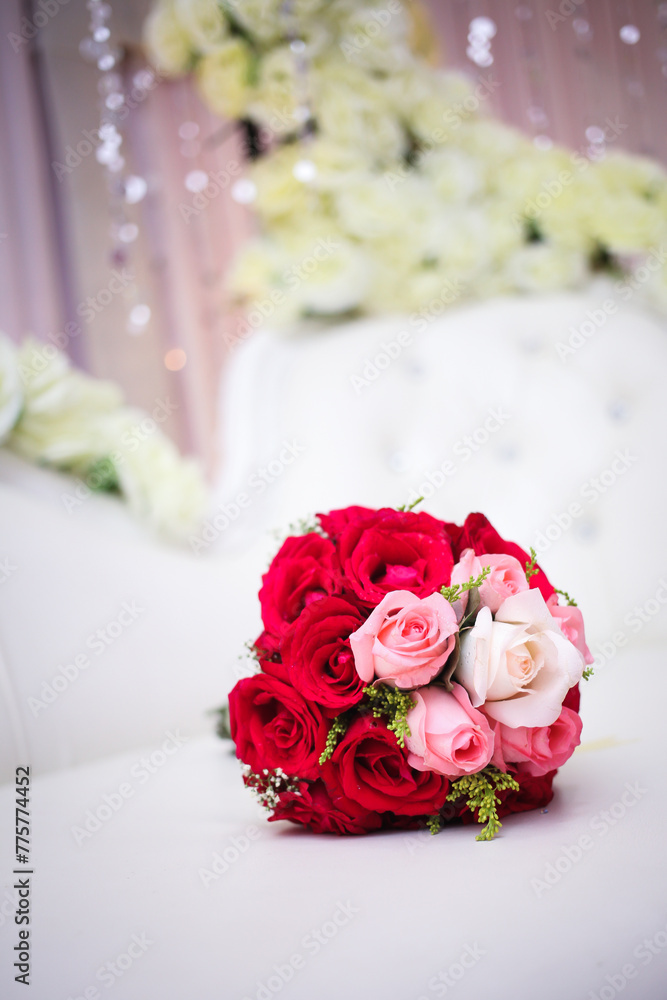 Wedding bouquet of the bride in red tones is on a white chair. Flowers for wedding reception.
