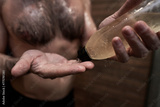 Caucasian man using shampoo under the shower