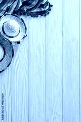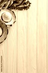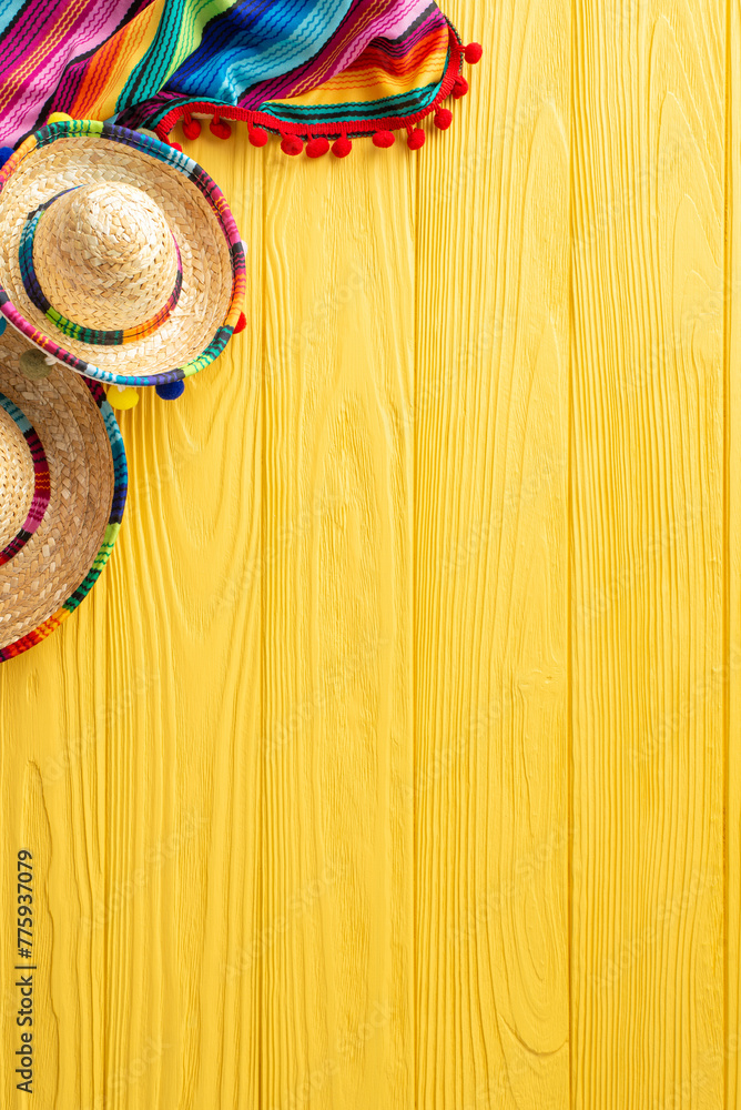 Celebrate Cinco de Mayo with vertical top view of sombreros and serape on a yellow desk. Great for text or adverts