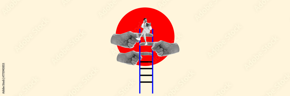 Man sitting on top of ladder and reading with human hands making stairs symbolizing support and assistance in reaching professional goals. Contemporary art collage. Concept of business, office, help