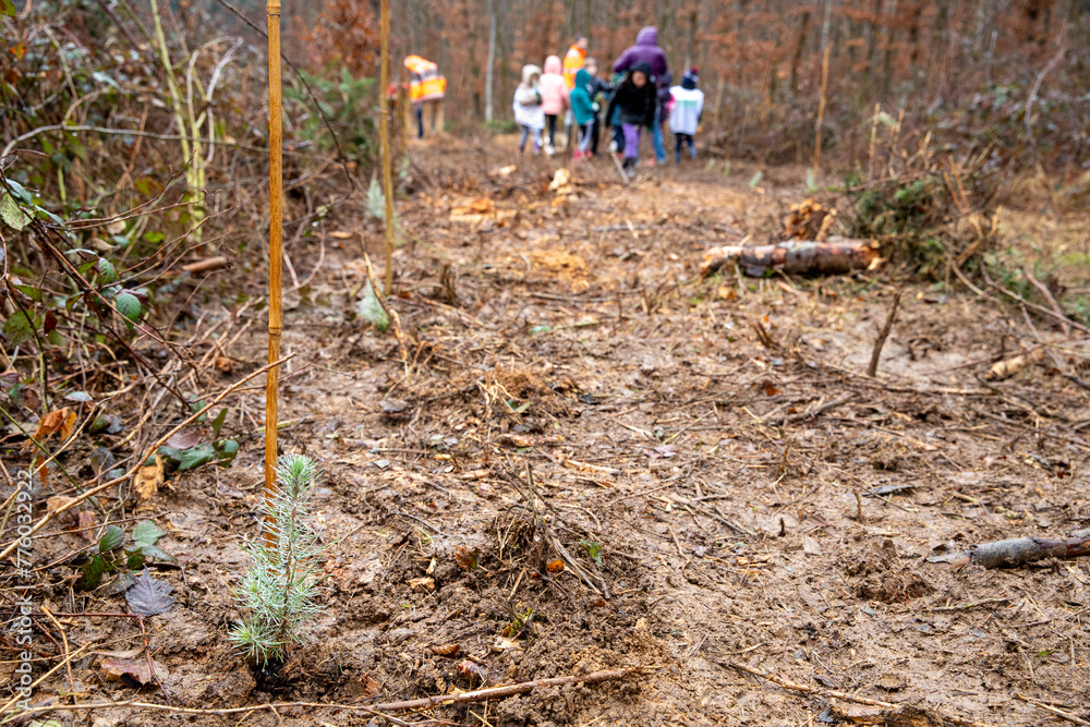 Gros plan sur un petit pin maritime tout juste planter en forêt