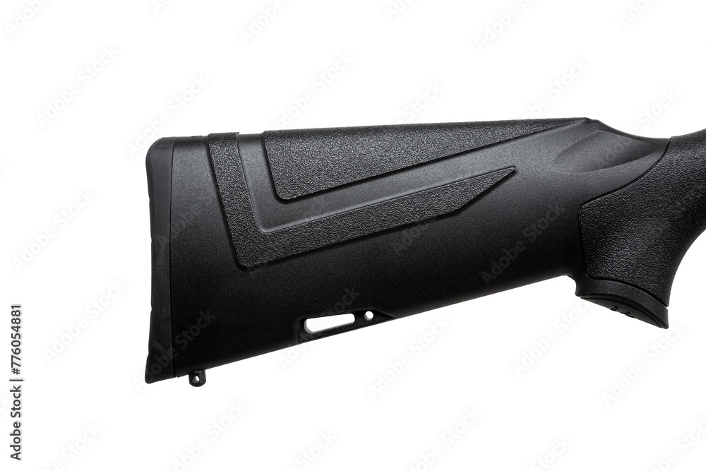 Close-up of a plastic rifle butt. Semi-automatic rifled carbine. Hunting rifle with a plastic butt. Isolate on a white background.