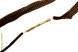Flexible cleaning rod made of nylon tape for pulling through the barrel and a brass brush. Isolate on a white back
