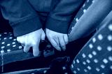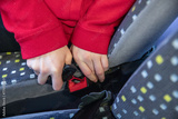 Gros plan d'un enfant attachant sa ceinture de sécurité dans un bus