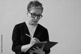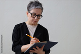A senior businesswoman meticulously plans finances, writing notes with dedication.