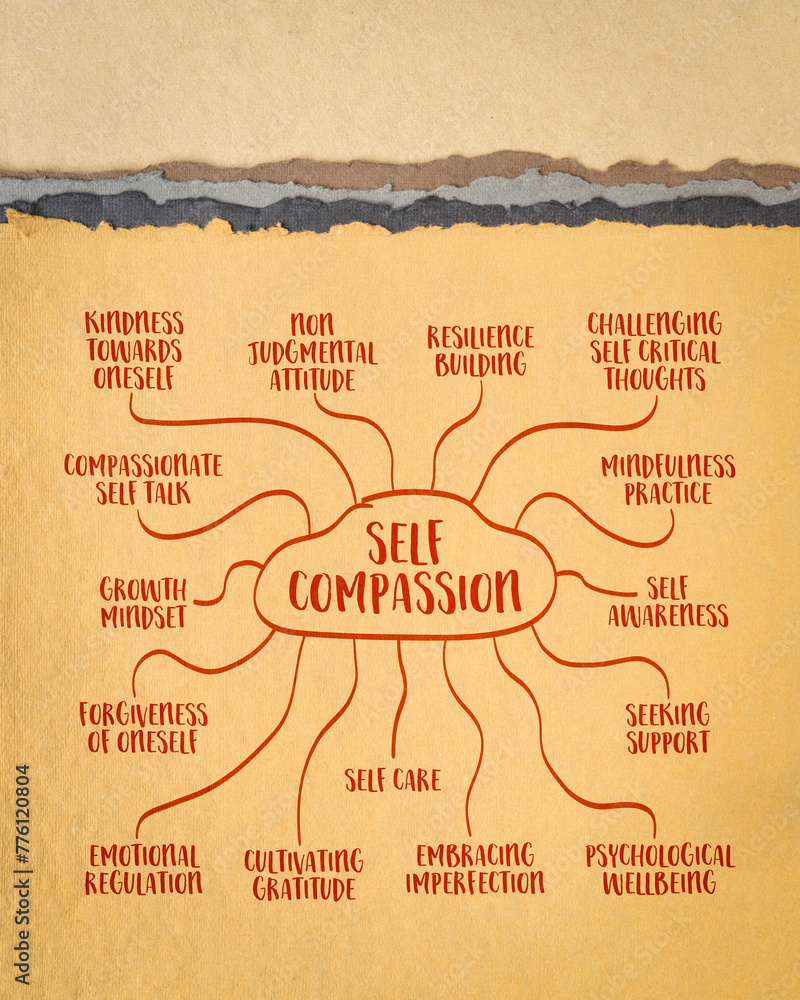 self compasion concept, treating oneself with kindness, understanding, and empathy, mind map sketch on art paper