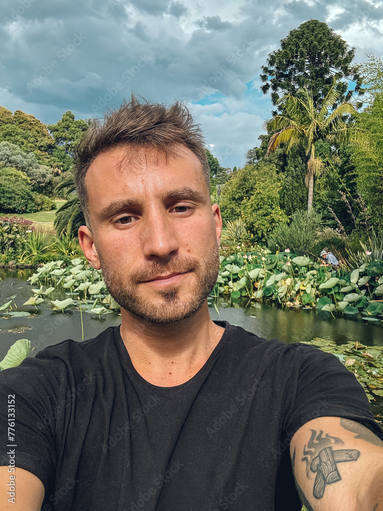 A man with a beard and a tattoo on his arm is taking a selfie in a park