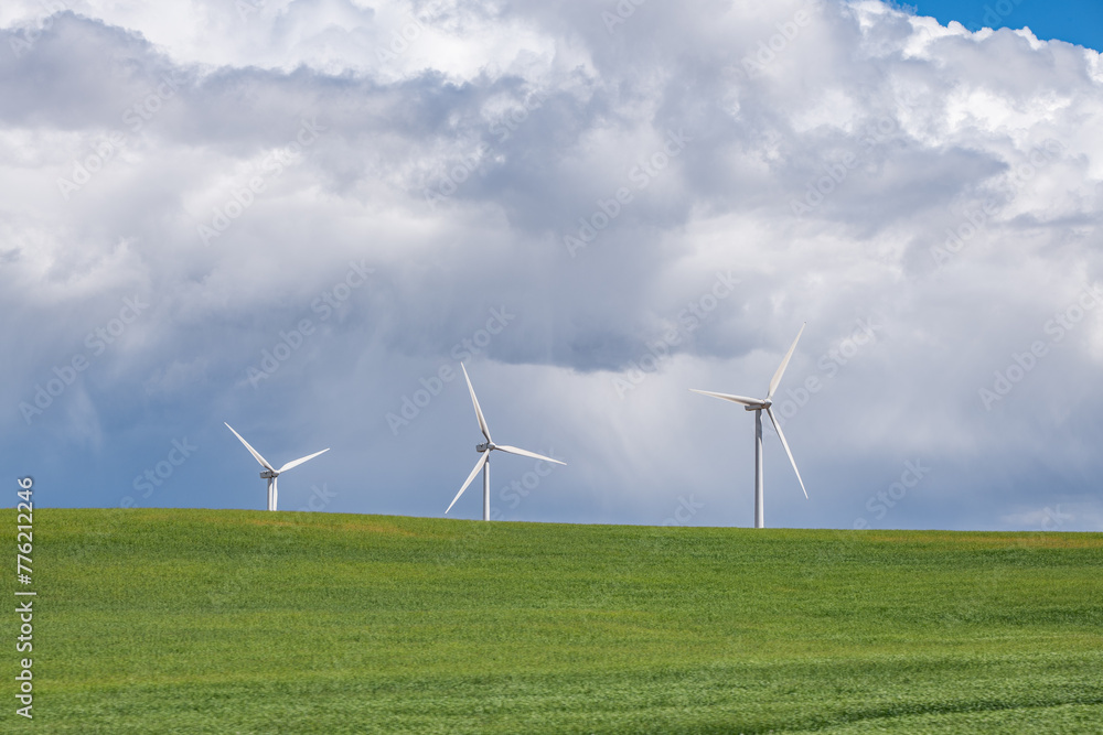Turbines in a mountain wind farm. Rapeseed and windwheels. Ecological energy production.
