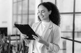 Successful elegant hispanic or brazilian woman, successful employee of a company, female teacher, standing with documents folder in hands in a modern creative office, reading information, smiles