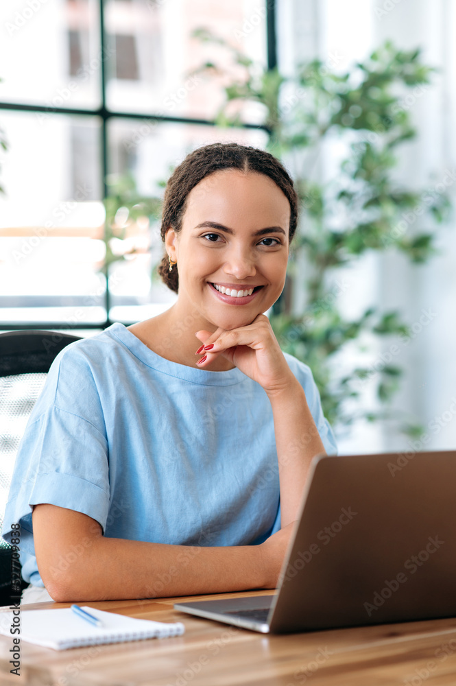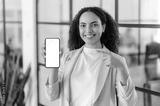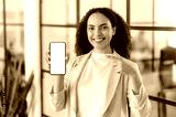 Mock-up, copy-space. Pretty brazilian or hispanic woman, stands in modern office, showing her smartphone with white mockup blank screen for advertising or announcement, point finger at it, smiles