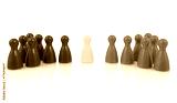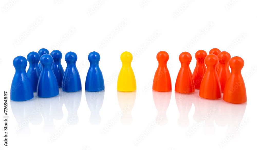 Yellow pawn in the middle between red and blue pawns