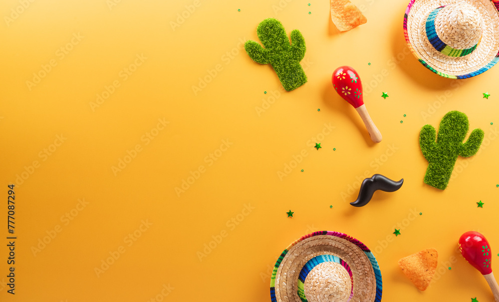 Cinco de Mayo holiday background made from maracas, cactus and hat on yellow background.