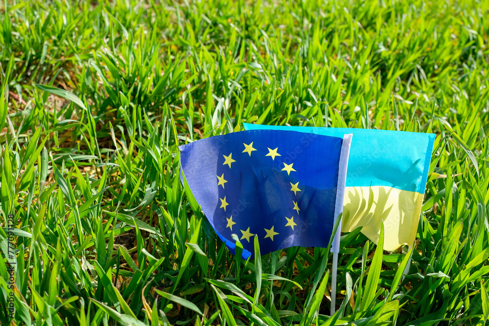 Flag of the European Union. Ukrainian flag. Wheat field. Ukraine has the status of a candidate for accession to the European Union.