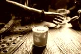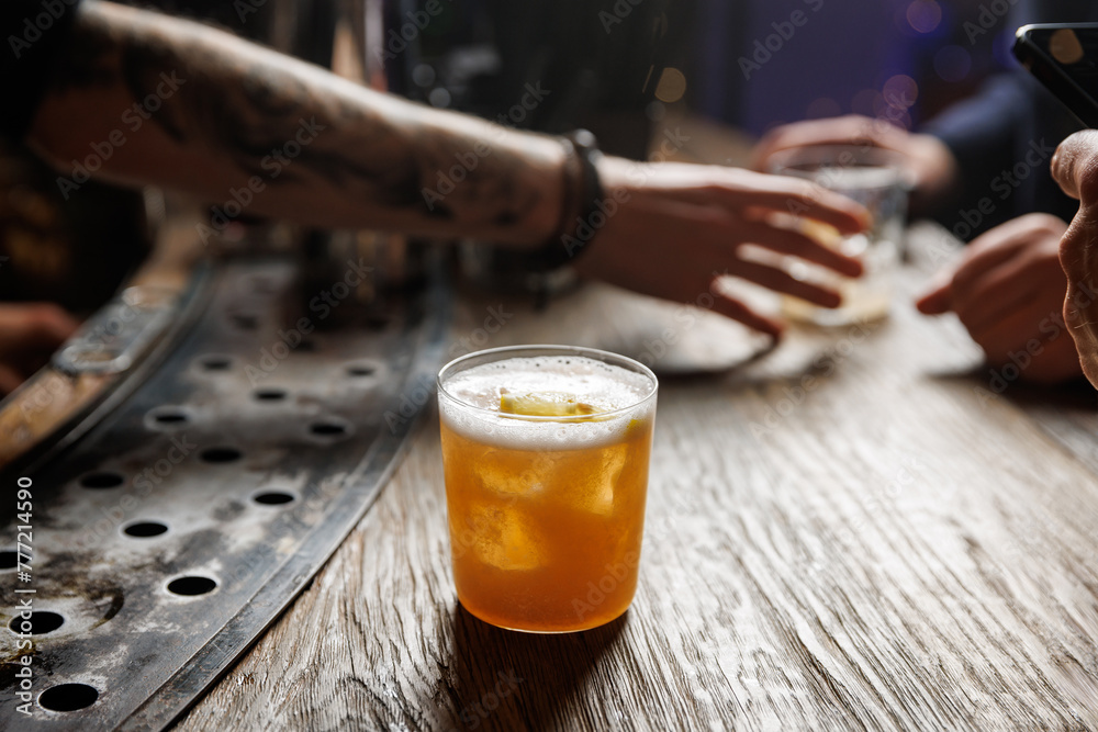 Whiskey sour cocktail on a wooden bar counter in a pub.