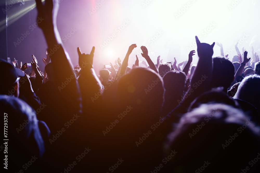 Electrifying atmosphere of a live music event, with the audience silhouetted hands.