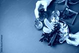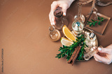 Perfumery workshop of creating citrus fragrance notes with citrus fruits, cinnamon, spices, capturing the crafting process of perfumery and the creation of scents infused with delightful citrus notes.