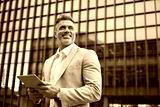 Happy business man investor of middle age in suit holding digital tablet, mature professional businessman leader using tab looking away standing in busy office city street thinking of future success.
