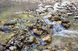 Morning on a mountain river, walking, awakening in nature summer sunny mood.
