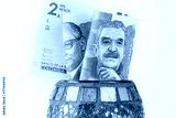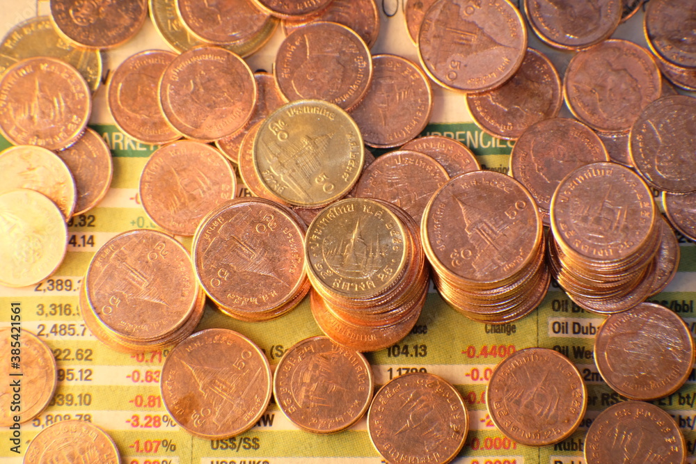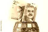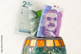 Colombian money, 50 and 100 pesos banknotes sticking out from a decorative bowl, Financial concept, Saving and economics
