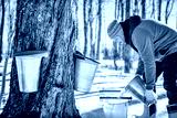 sugar shack, a maple farmer wearing a traditional clothe working take maple water