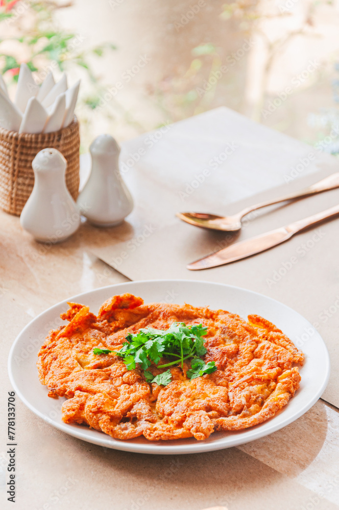 Omelet stuff minced pork on marble table background, Thai style call 'khao kai jeaw moo sab" high view