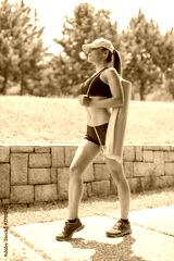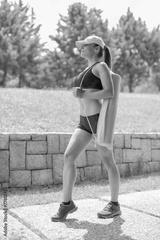 beautiful young athlete carrying yoga mat roll in park