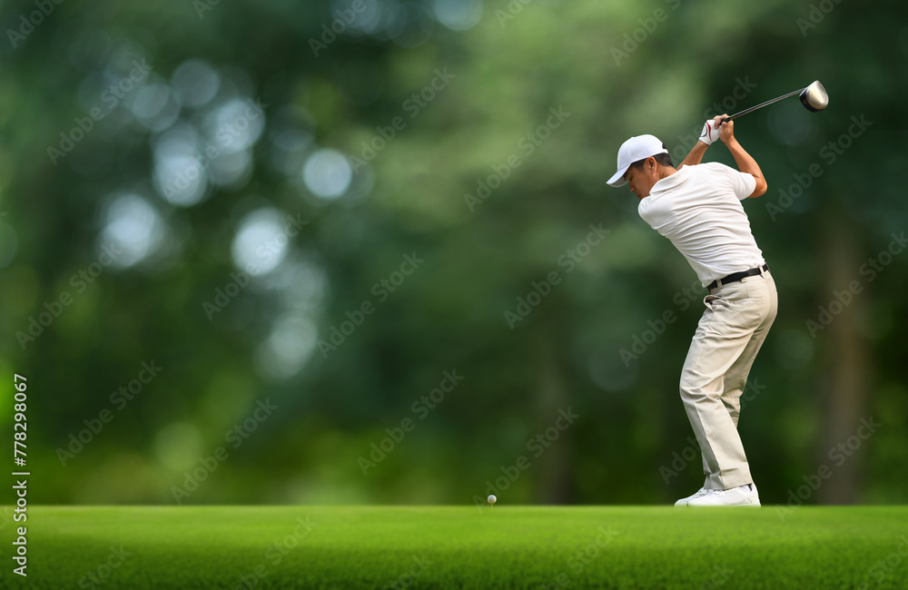 Front view of Golfer driver back swing before hitting golf ball down the fairway.