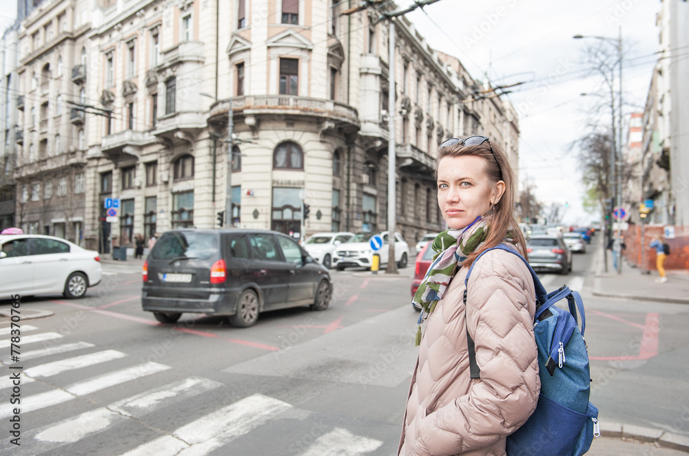 Beautiful woman with bagpack and sunglasses standing on the street in the Belgrade city, Serbia