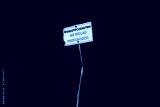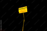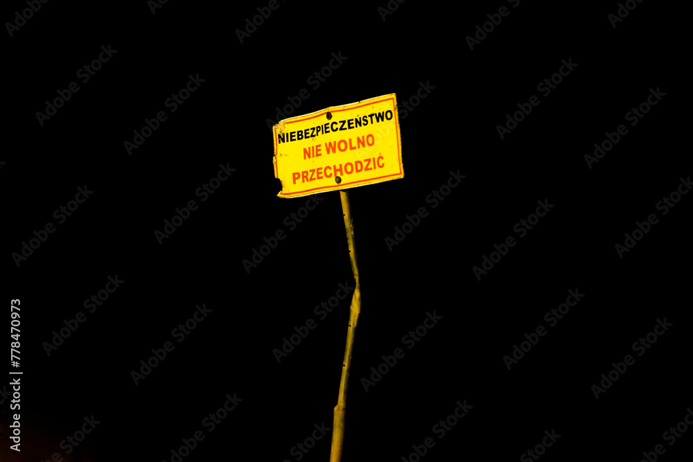 Znak NIEBEZPIECZEŃSTWO, NIE WOLNO PRZECHODZIĆ .Tablica ostrzegawcza w nocy. Znak ostrzegawczy oświetlony lampą elektryczną, umieszczony na krawędzi dużego dołu - wyrobiska kamieniołomu.