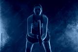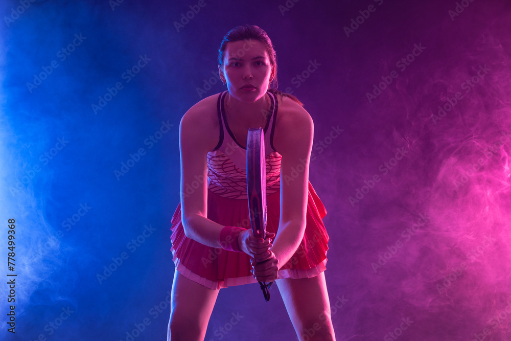 Padel tennis player with racket on tournament. Girl athlete with paddle racket on court with neon colors. Sport concept. Download a high quality photo for design of a sports app or tour events.