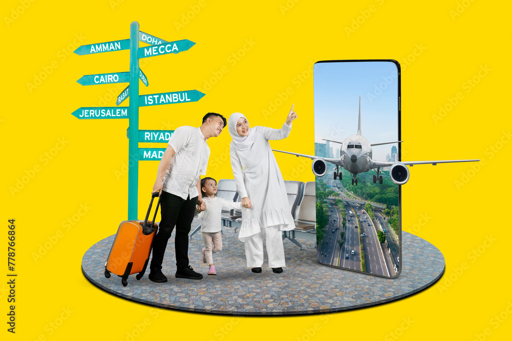 Young couple with daughter and travel suitcase standing in front of big smartphone