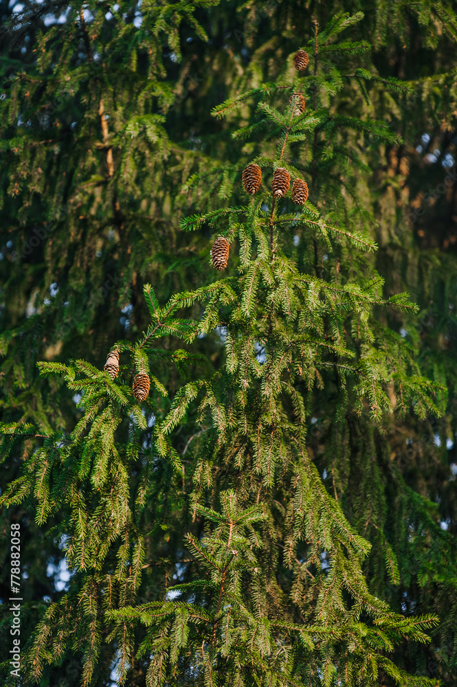 Coniferous green tree, pine with hanging cones in the forest. Nature photography.