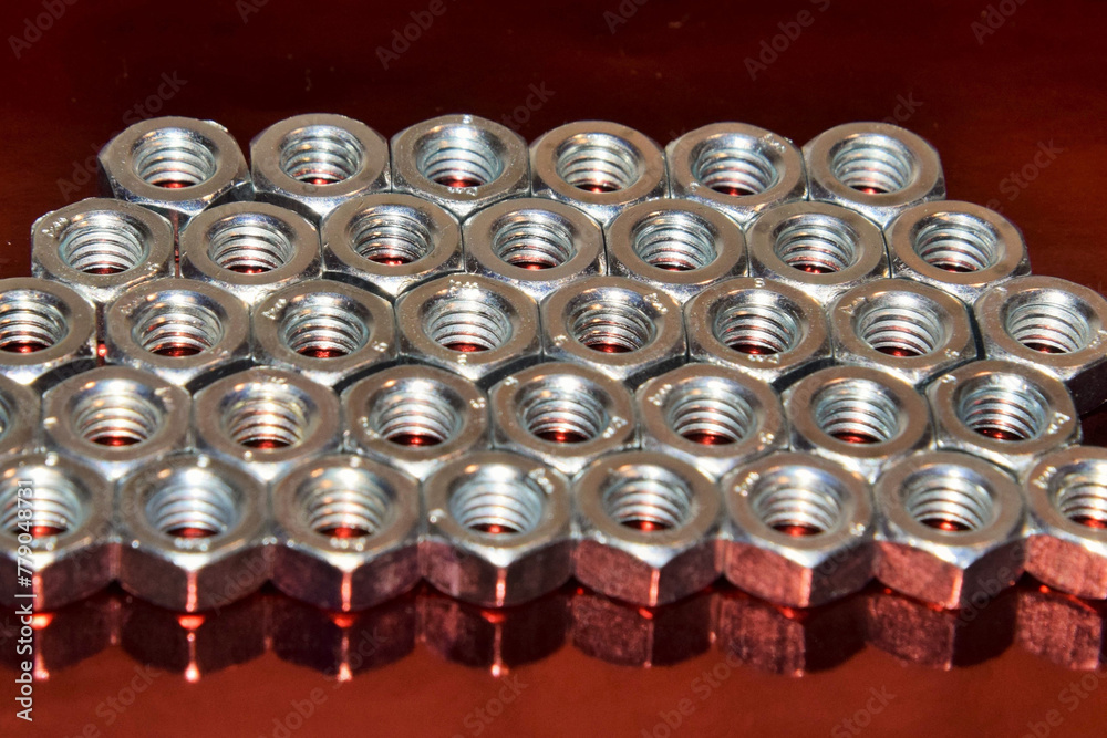 Industrial background. Composition of nuts laid out in even rows on a red background