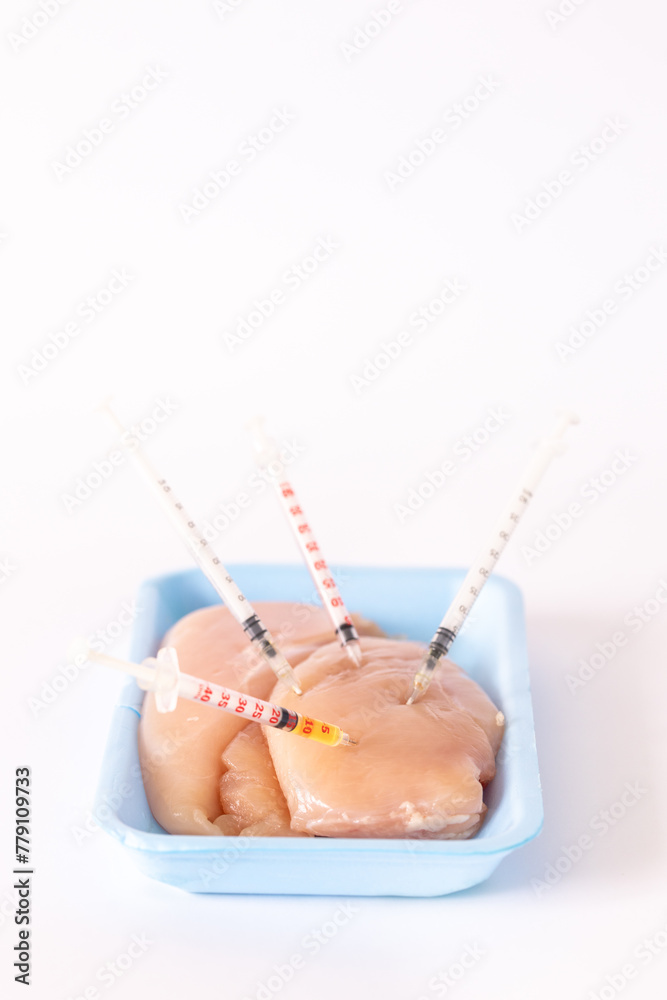 Chicken meat on a tray with syringes stuck in it, Nutrition concept, antibiotics in meat, Chemically stuffed food, White background, vertical