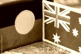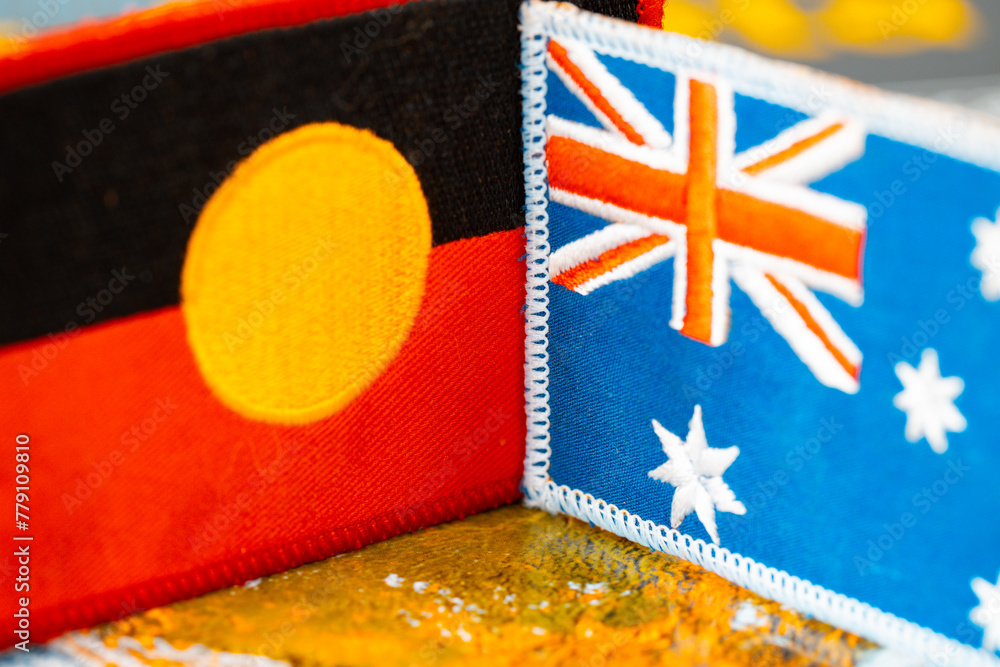 Aboriginal and Australian flag. Concept, common land. Settlers' responsibility towards the indigenous people of Australia, close up