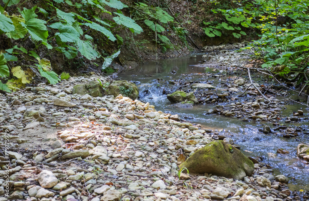 Morning on a mountain river, walking, awakening in nature summer sunny mood.