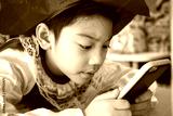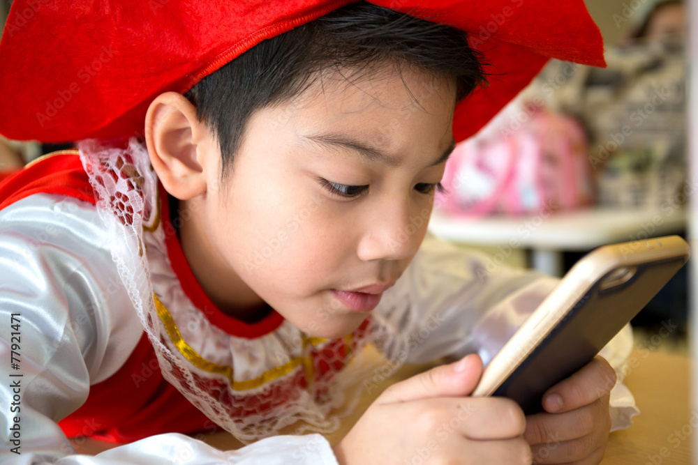 Asian child using a digital tablet together .