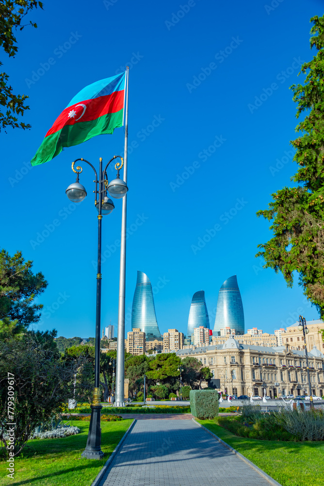 Flagpole with flag of Azerbaijan at seaside promenade in Baku