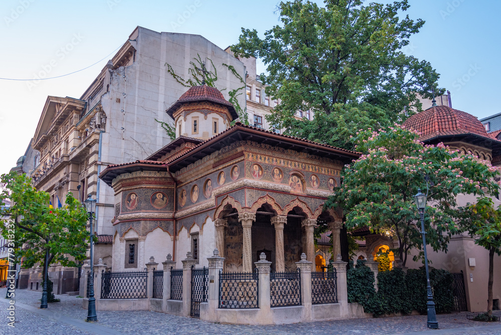 Sunrise view of The Church of the Stavropoleos Monastery in bucharest, Romania
