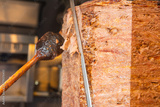 Turkish dish consisting of spiced lamb cooked on a spit and served in slices, typically with pita bread.